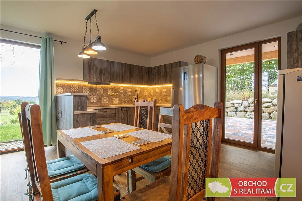 Výstavba rodinného domu byla dokončena v roce 2023. Dřevostavba vystavěná v energetické třídě A nabízí dispozici 3+KK s užitnou plochou 102 m². Dispoziční plán domu přikládáme do fotodokumentace této inzerce. Promyšlená dispozice obsahuje technickou místnost, spíž i šatnu, tedy dostatek úložných prostor mimo obytné místnosti; dále obsahuje obývací pokoj 46 m² s francouzským oknem a výhledem do krajiny; součástí jsou dvě koupelny, ta první se nachází u ložnic, ta druhá je přístupná ze zahrady (při pobytu venku máte k dispozici sprchový kout i WC). V celém domě je příjemné podlahové topení, v obývacím pokoji je možné topit též kamny.