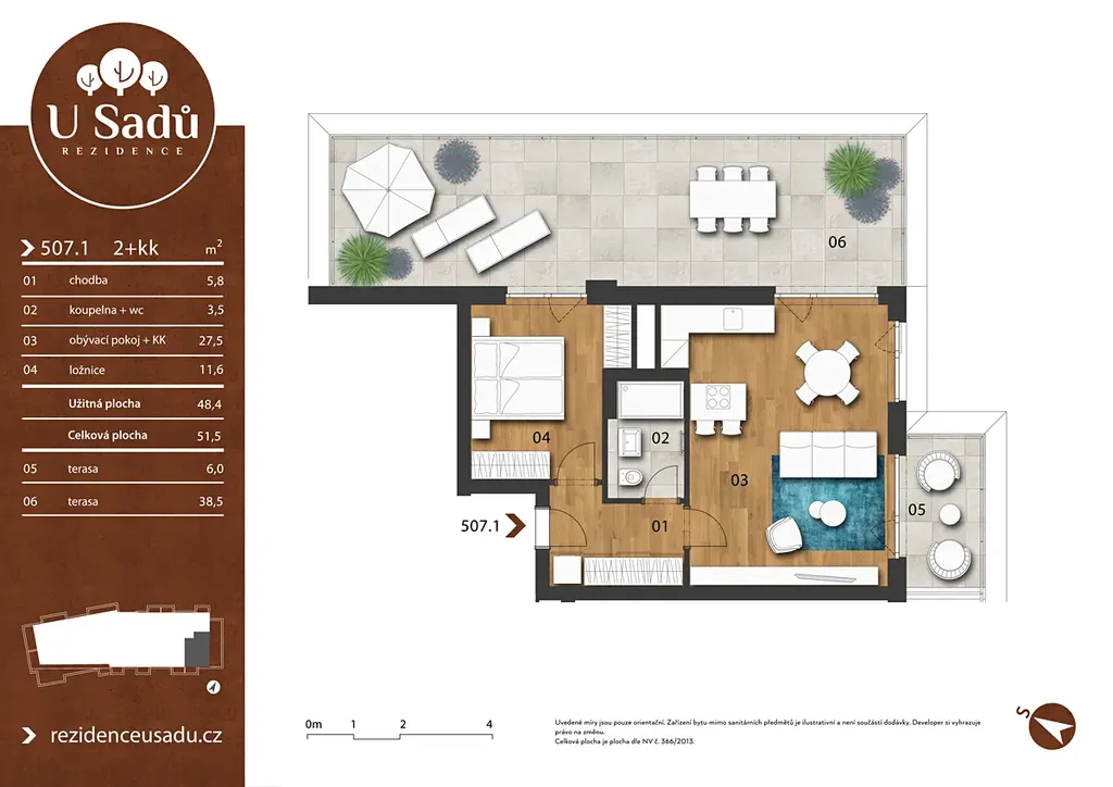 Nabízíme krásný byt 2+kk o celkové výměře 51,5 m2, který je umístěn v 5. patře budovy. Součástí bytu jsou navíc i dvě nádherné terasy o celkové výměře 44,5 m2 (Jedna útulná terasa o 6 m² ideální pro ranní kávu, druhá s velkorysými 38,7 m² nabízí prostor pro setkávání i odpočinek.)