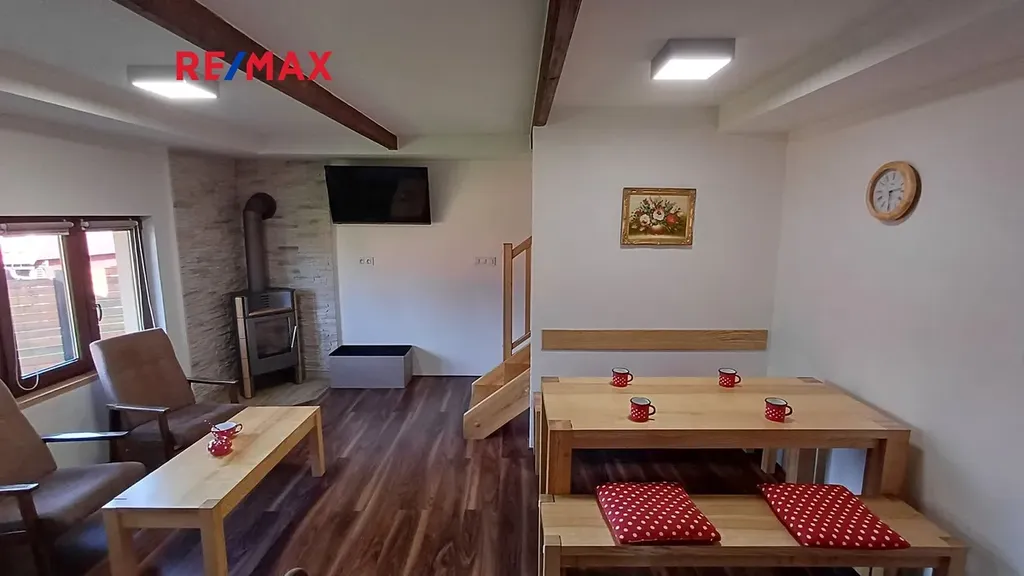 Chata nabízí dostatek prostoru i soukromí – čtyři prostorné pokoje pohodlně ubytují až 10 osob. Srdcem domu je světlý obývací pokoj s krbem, kde si snadno představíte večery po výletě, kdy venku voní les a uvnitř praská dřevo. Na něj navazuje plně vybavený kuchyňský kout, připravený na víkendové vaření i delší pobyty.