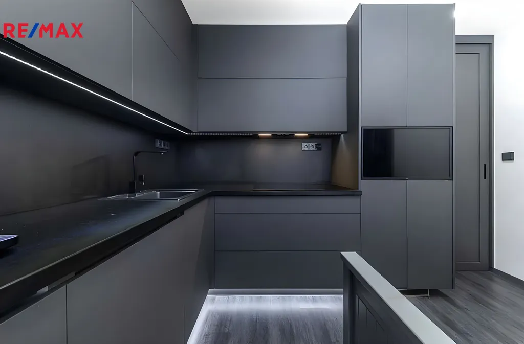 Byt prošel kompletní rekonstrukcí a pronajímá se včetně veškerého vybavení. K dispozici je postel, vestavěné skříně s dostatkem úložného prostoru, pračka i sušička, takže se můžete ihned nastěhovat bez dalších investic. Interiér působí velmi čistě a moderně, přičemž tmavé prvky dodávají prostoru styl a originalitu.