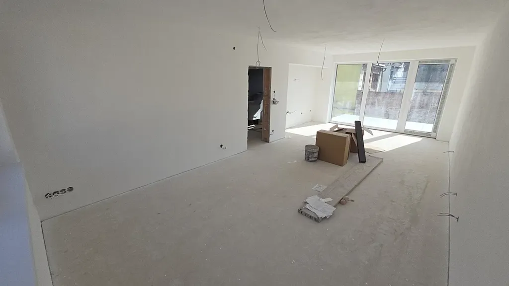Dispozičně 2+KK (dělicí příčka se ještě bude dodělávat), ideální pro jednotlivce nebo pár. Obývací část s kuchyní (dodáváme standardně bez kuchyňské linky) a vstupem na terasu. Předsíňka s prostorem pro pračku a úložné prostory a koupelna s walk-in sprchovým koutem.