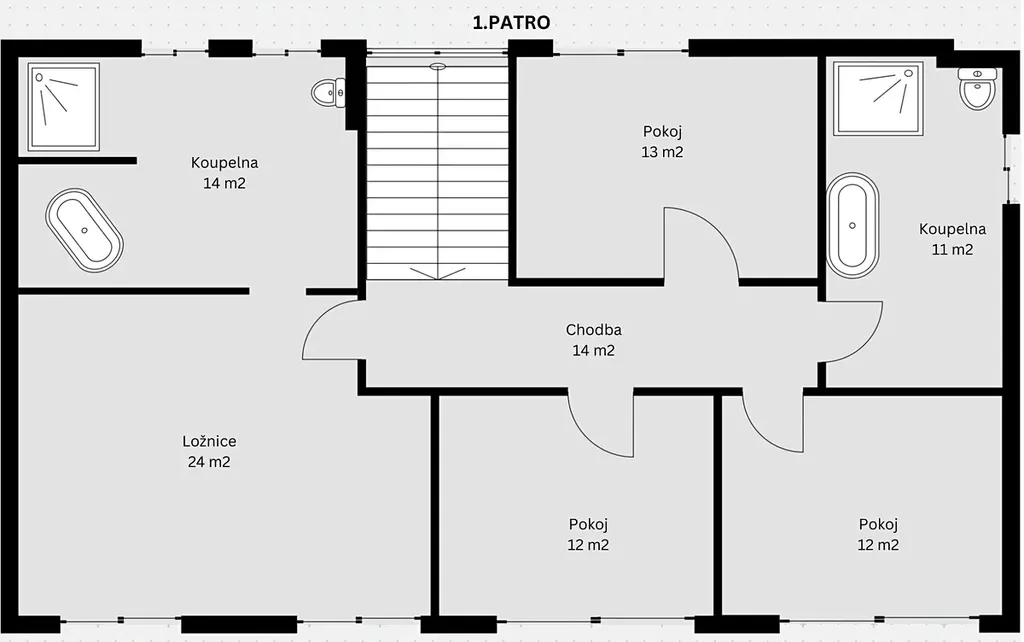 • 1. patro: čtyři pokoje a dvě koupelny. Každý pokoj má přímý vstup na balkón.