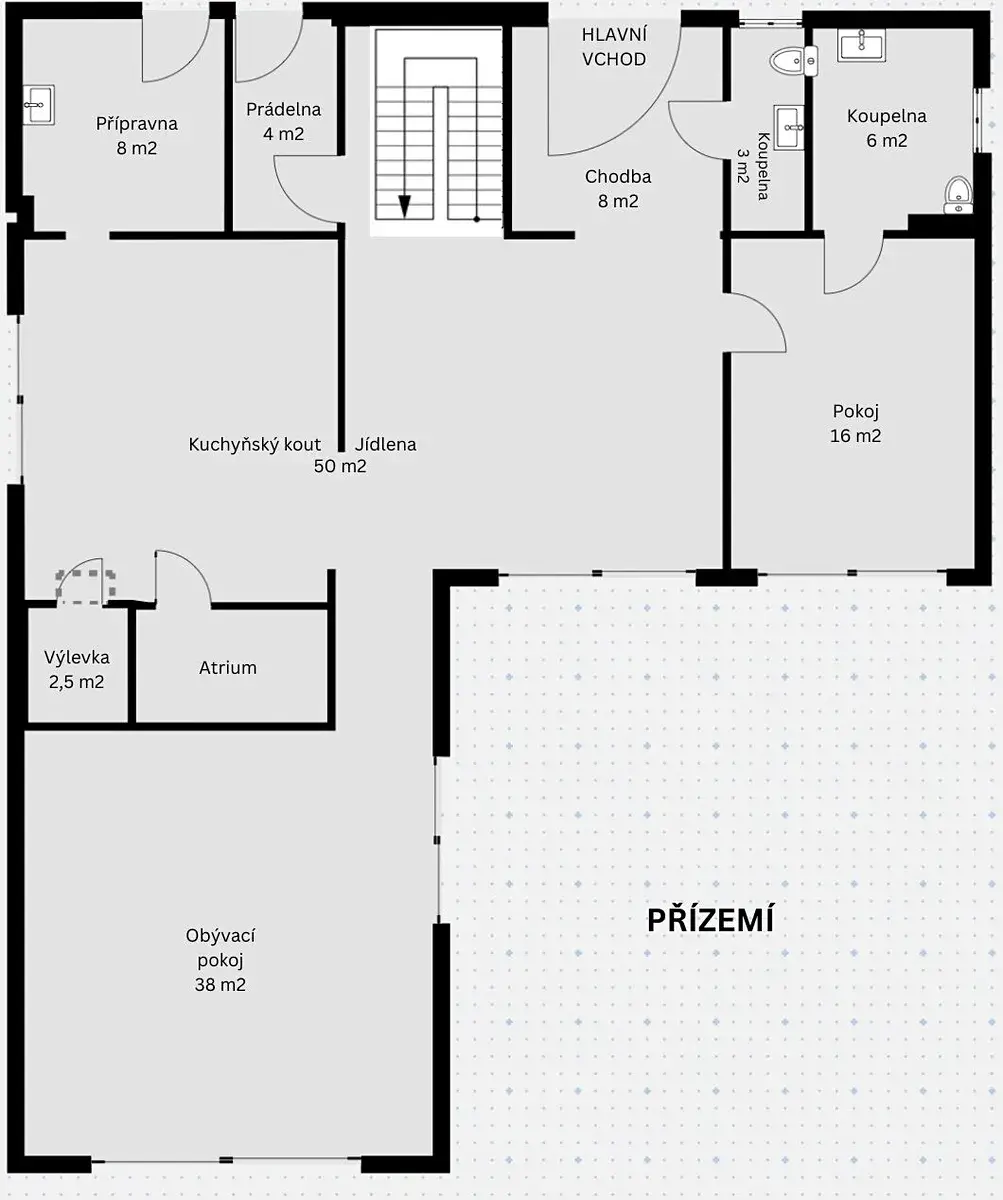 • Přízemí: světlý a prostorný obývací pokoj s kuchyňským koutem ke kterému náleží přípravna, samostatný pokoj, dvě koupelny, a technická místnost s prádelnou.