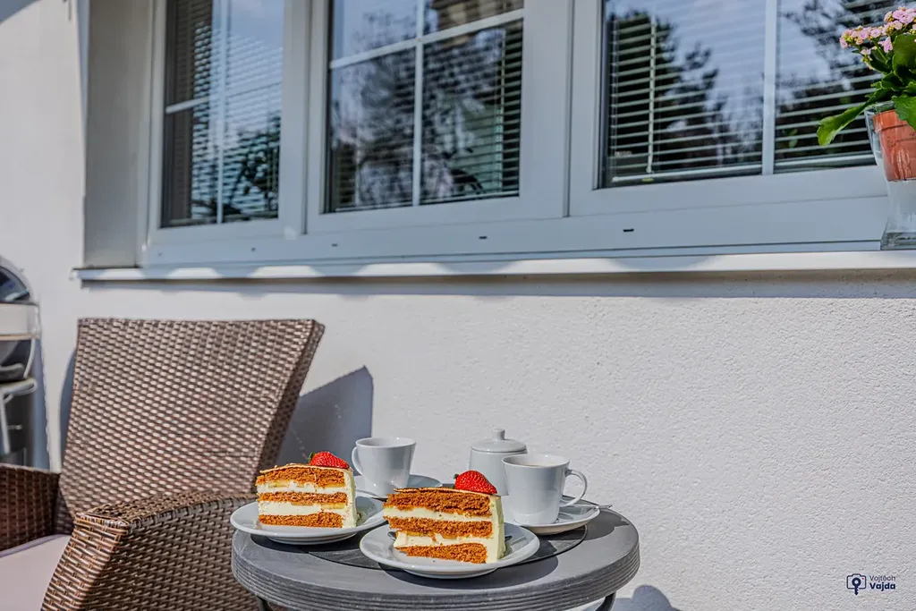Interiér domu byl navržen s důrazem na kvalitu, prostor a funkčnost. O vytápění domu se stará tepelné čerpadlo značky Nibe, které zajištuje efektivní a úsporný provoz. V horkých letních dnech oceníte klimatizaci. Velkou přidanou hodnotou je instalovaná fotovoltaická elektrárna, díky které jsou měsíční náklady na energie prakticky nulové. Celkové roční náklady na elektřinu za rok 2025 byly 26 tis Kč a celkové příjmy díky smlouvě na fotovoltaickou el. byly 35 tis Kč. S ohřevem teplé vody pomáhají solární kolektory.