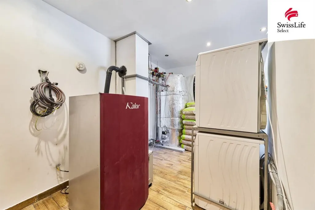 Vytápění zajišťuje kotel na pelety s rozvodem do podlahového topení, dále je příprava na elektro kotel. Ohřev vody el. bojler. Dům je napojen na veřejný vodovod a odpadní vody jsou svedeny do čističky odpadních vod. Na pozemku se nachází retenční nádrž na dešťovou vodu. Součástí prodeje je také garáž umístěná přes silnici.