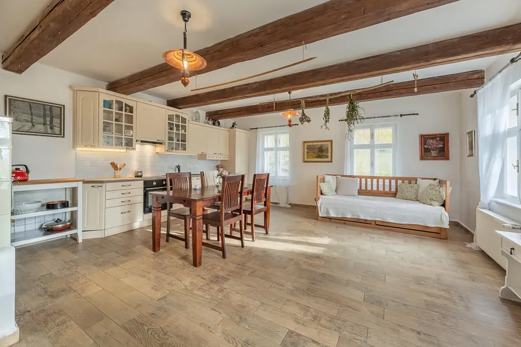 Dům nabízí přízemí a obytné podkroví. Objekt prošel rozsáhlou rekonstrukcí v letech 2016-2021 - nová střecha, nová elektřina, rozvody vody, ohřev bojlerem a vytápění elektrokotlem (částečně radiátory a částečně podlahové topení). Nová okna a dveře ve dřevě na míru. Stylové vypínače a zásuvky, odhalené pískovcoví zdivo a spousta další detailů. Příprava na druhou kopelnu a další pokoj na půdě. Sklep na víno.