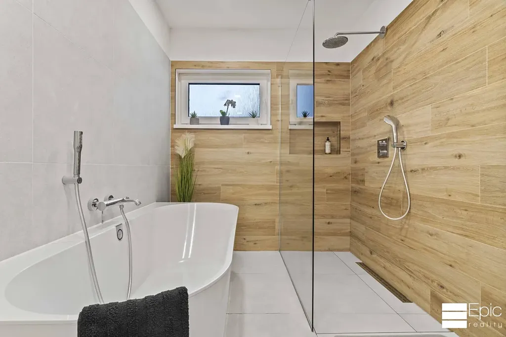 Dispozice 4+kk nabízí tři samostatné pokoje (ložnice + 2 další), technickou místnost a praktické úložné zázemí. Komfort doplňují 2× WC. V koupelně oceníte kombinaci walk-in sprchy, vany a dvojumyvadla typický prvek domů, kde se myslelo na každodenní rodinný provoz.