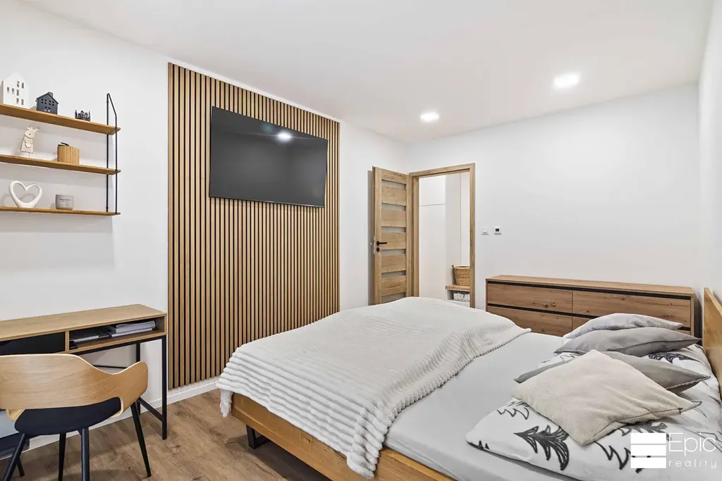 Srdcem domu je velkorysý otevřený prostor propojující kuchyň, jídelnu a obývací část vzdušný, světlý a ideální pro rodinný život i návštěvy. Kuchyně je na míru od truhláře a zaujme designovým řešením odsávání výsuvná digestoř elegantně zajíždí do pracovní plochy. Pro pocit útulna a domova krásně fungují i výrazné dřevěné prvky v obytné části, stejně tak vkusné světelné kulisy které si můžete volit dle nálady.