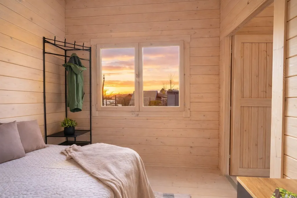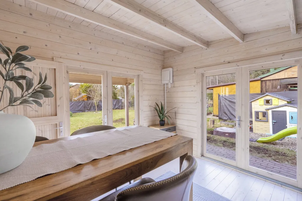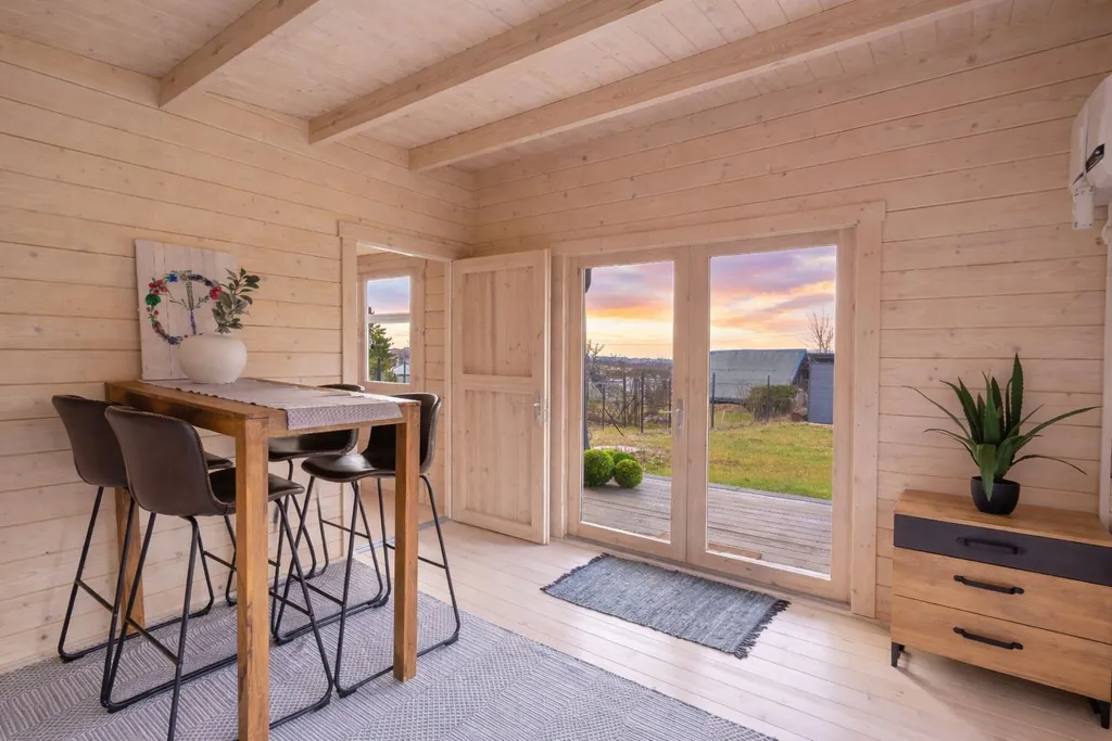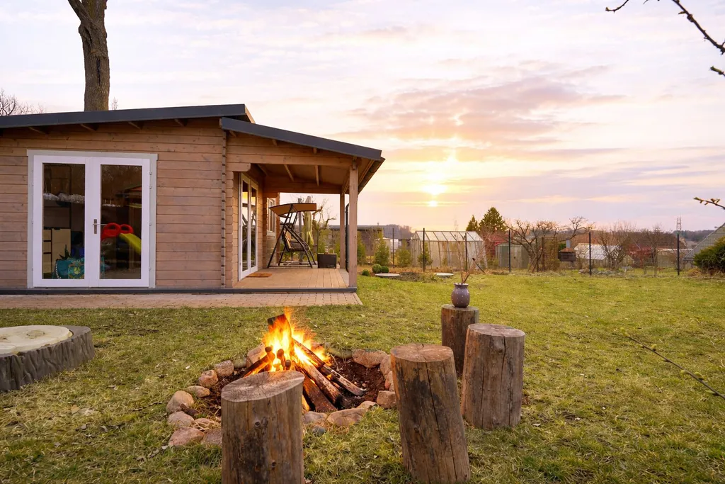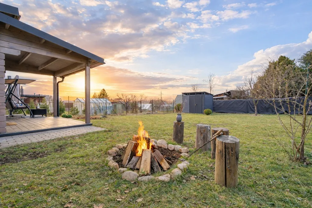 V ceně je zahrnuto následující vybavení: kuchyňská linka s dřezem, mini lednice, jedno-plotýnkový vařič, barové sezení z masivu + 4 barové židle, 2x noční stolek, lůžko, zrcadlo, věšák, zahradní houpačka, konferenční stolek, sud na dešťovou vodu, dětská trampolína, klouzačka, domeček a pískoviště.