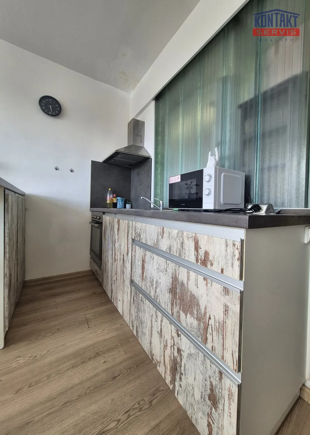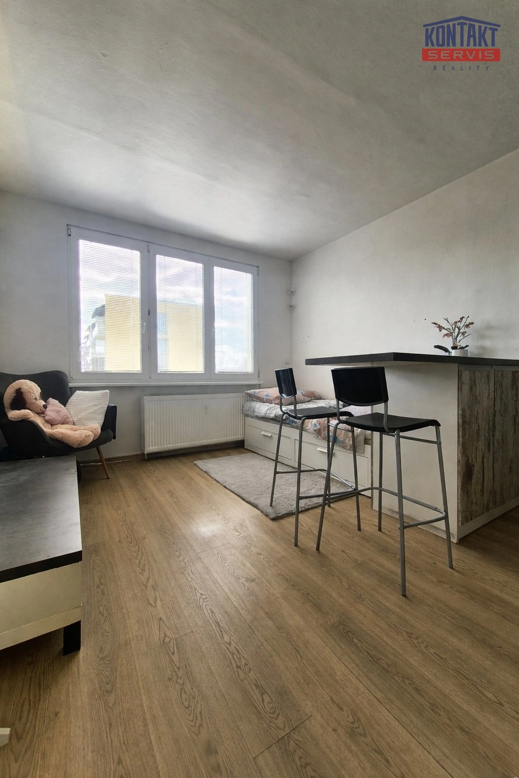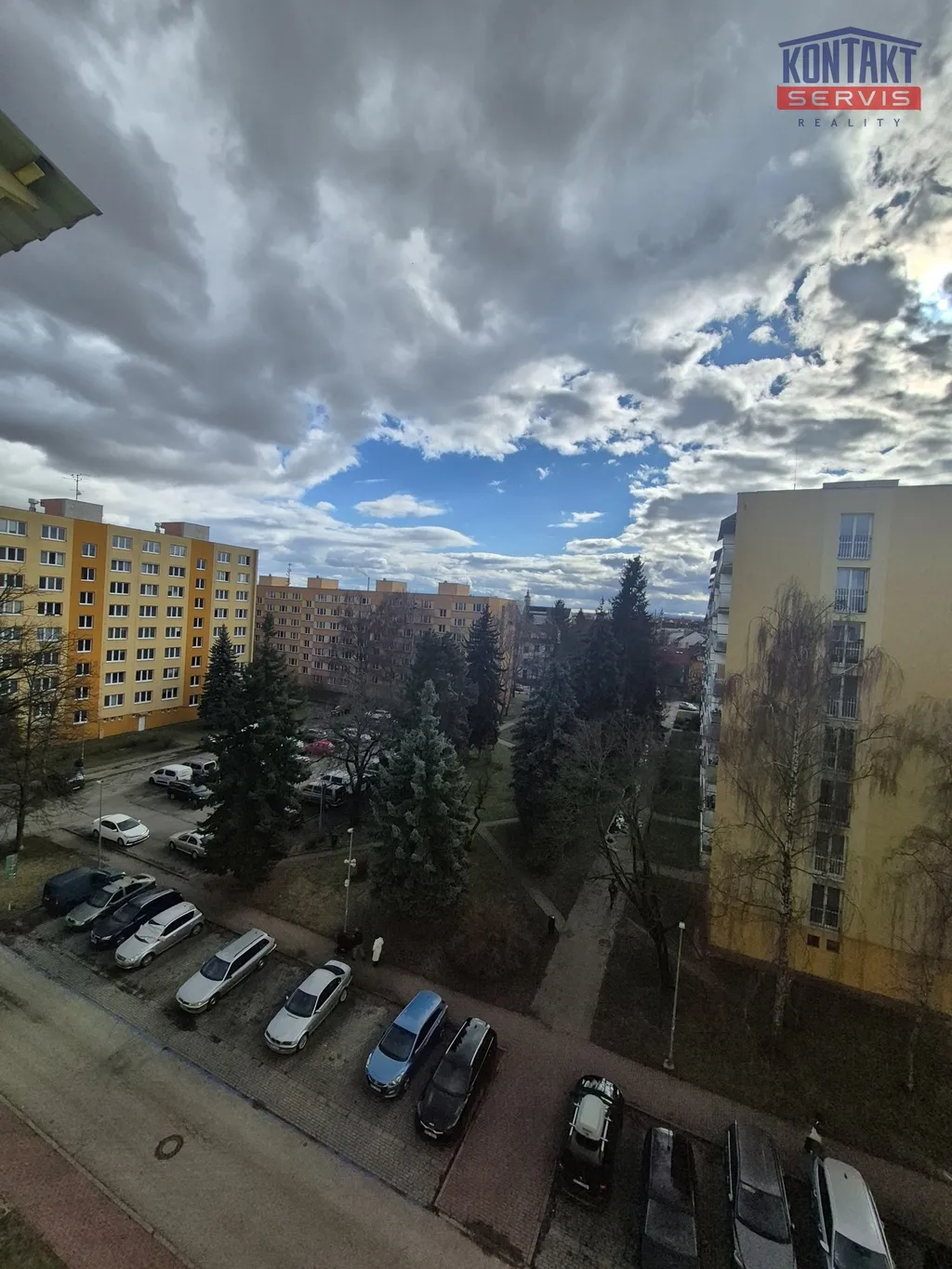 Okno je orientováno směrem na Pekárenskou ulici s výhledem do parku a na obchodní centrum IGY.