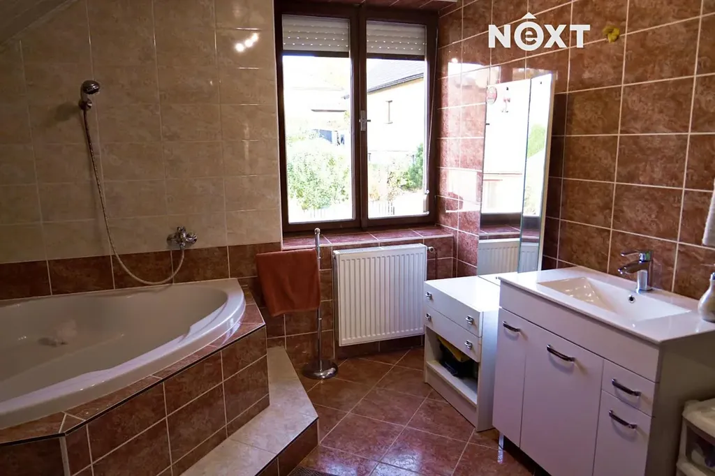 Podkroví: dřevěné schodiště s chodbou kterou se vstupuje do jednotlivých pokojů – ložnice s balkonem cca 23 m2 a dvou dětských pokojů cca 18 m2 a 21 m2, dále prostorná koupelna s WC, rohovou vanou a umyvadlem, je zde volný prostor třeba pro domácí saunu.