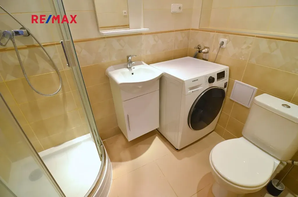 Koupelna (3,2 m2) je vybavená sprchovým koutem, umyvadlem a WC. K dispozici je pračka se sušičkou.