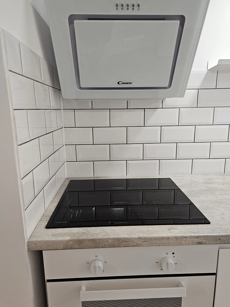kuchyň s vestavěnými spotřebiči (lednice s mrazákem, mikrovlnná trouba, varná deska)