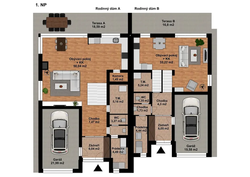 Projekt počítá se dvěma plně samostatnými domy (5+kk):
