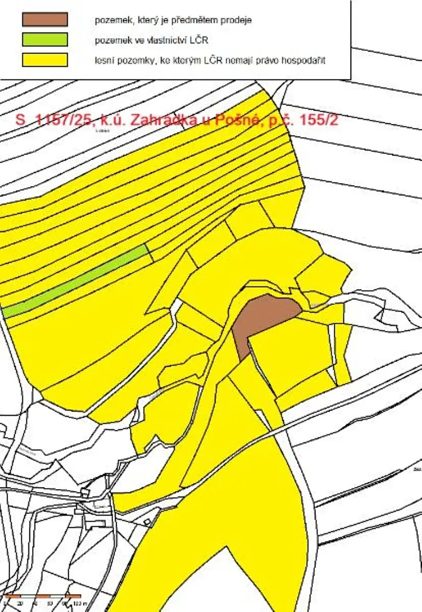 Jedná se o prodej lesního pozemku parc. č. 155/2 o výměře 3636 m2, nepravidelného tvaru, situovaného severně od obce Zahrádka, obklopeného privátními lesy. V LHP je pozemek veden jako bezlesí, nachází se na něm spontánně vzniklý různověký a různorodý převážně listnatý porost, jinak je pozemek zarostlý trávou.
