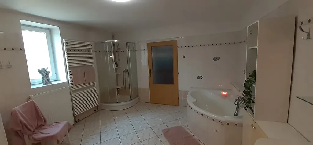 Koupelna je vybavena jak sprchovým koutem, tak velkou vanou.