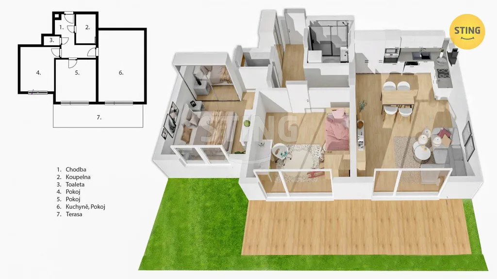 Nabízíme k pronájmu moderní byt o dispozici 3+kk, který se nachází v obci Bílov. Jedná se o novostavbu s celkovou užitnou plochou 74,32 m². Bytová jednotka zahrnuje zádveří, ložnici, hostinský pokoj, koupelnu se sprchovým koutem, samostatné WC a prostornou kuchyň propojenou s jídelní částí s obývacím pokojem. Z obývacího pokoje je přímý vstup na terasu, přičemž přístup na terasu je možný také ze všech ostatních místností, v oknech jsou venkovní žaluzie (dálkové ovládání). Součástí terasy je předzahrádka vše o celkové velikosti 97,59m2. Kuchyně bude k dispozici včetně vestavěných spotřebičů. Vytápění je zajištěno centrálním tepelným čerpadlem Regulus - termostat v každém bytě pro individuální nastavení teploty, podlahové teplovodní vytápění v každém bytě, ohřev TUV centrální s cirkulačním rozvodem a měřičem spotřeby v každém bytě, nemovitost je napojena na vodovodní řád, kanalizaci, elektřinu. Součástí bytu je parkovací stání s elektrodobíjecí stanicí, k dispozici společná kolovna. K bytu náleží možnost využití společné komunitní zahrady, která je pro obyvatele domu. Lokalita nabízí výbornou dopravní dostupnost do Ostravy (15min autem), do Bílova (5min autem) a umístění nemovitosti má výbornou dostupností na dálnici D1. V obci se nachází kompletní občanská vybavenost. Fotky - vizualizace. Měsíční nájem 25.000,- Kč (plus elektřina, služby, kauce 2 měsíce, provize realitní kanceláři.)