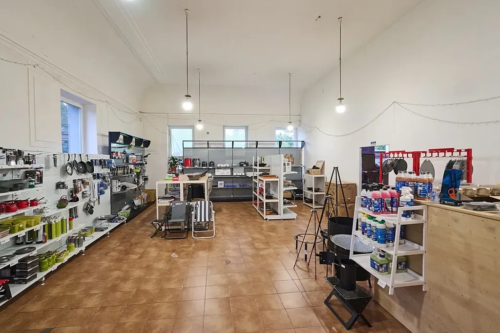 • První podlaží (přízemí): kancelář, skladovací prostory, toalety, sprcha a rozlehlý sál (aktuálně využívaný jako sklad) – celková plocha 356 m²