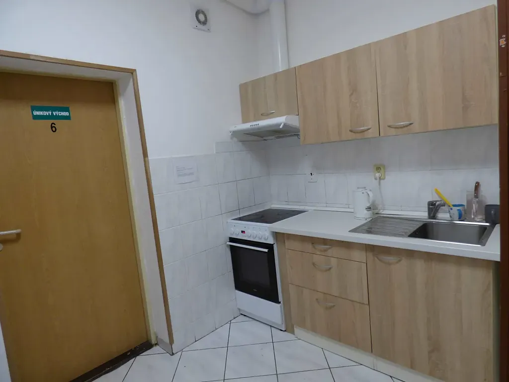 Součástí nájmu je možnost užívání kuchyně s vybavenou kuchyňskou linkou, koupelna se sprchovým koutem a WC. Prostory jsou společné pro celkem 5 pokojů. Za drobný poplatek je možné použít pračku a vysavač.