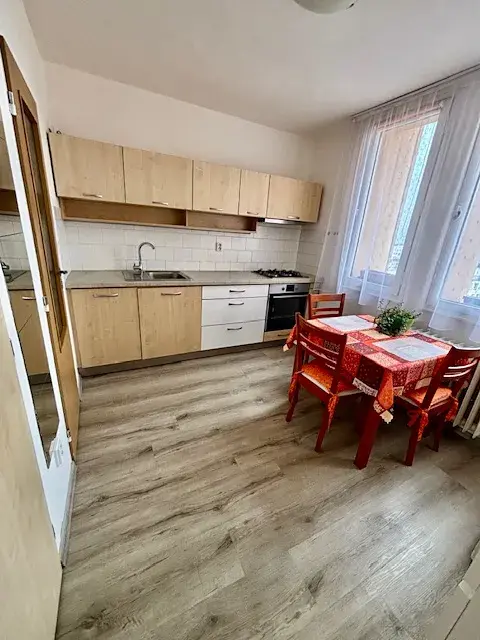 Byt je zařízený a vybavený včetně pračky, rozkládací sedací soupravy, jídelní stůl se židlemi, praktická šatna se skříněmi.