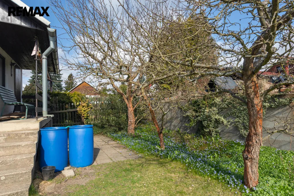 Zahrada je pečlivě udržovaná a nabízí ideální kombinaci pro pěstování i relax. Nachází se zde ovocné dřeviny a keře (jabloně, borůvky, rybíz) a také skleník ve velmi dobrém stavu.