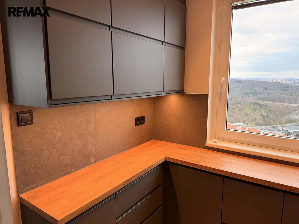 Exklusivně nabízíme k prodeji jedinečný byt 3+1 L s komorou a šatnou. po kompletní rekonstrukci v 19. patře s neopakovatelným výhledem. Byt splňuje nároky na moderní a komfortní bydlení ve vysokém standardu. Nová kuchyňská linka vyrobená na míru, vybavená novými kvalitními vestavěnými spotřebiči, lednicí s mrazákem, indukční varnou deskou, horkovzdušnou troubou, myčkou na nádobí, mikrovlnnou troubou a Byt má zasklené dvě lodžie přes celý byt. v tichu 19 patra s dechberoucím výhledem na les a každodenní shon města, mimochodem pohledem ze stejné výšky se mohou nechat unášet výhledem i např. obyvatelé nedalekého V-Toweru. Vstup do domu je bezbariérový situovaný v prestižním rezidenčním projektu, zabezpečený kamerovým systémem se záznamem, k dispozici jsou dva výtahy - osobní i nákladní.