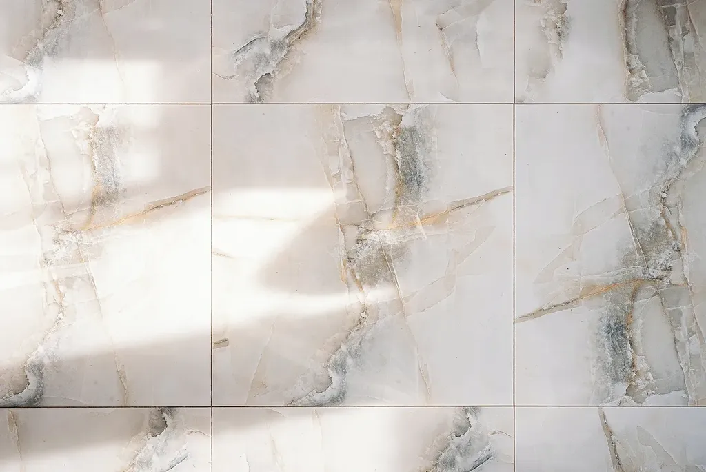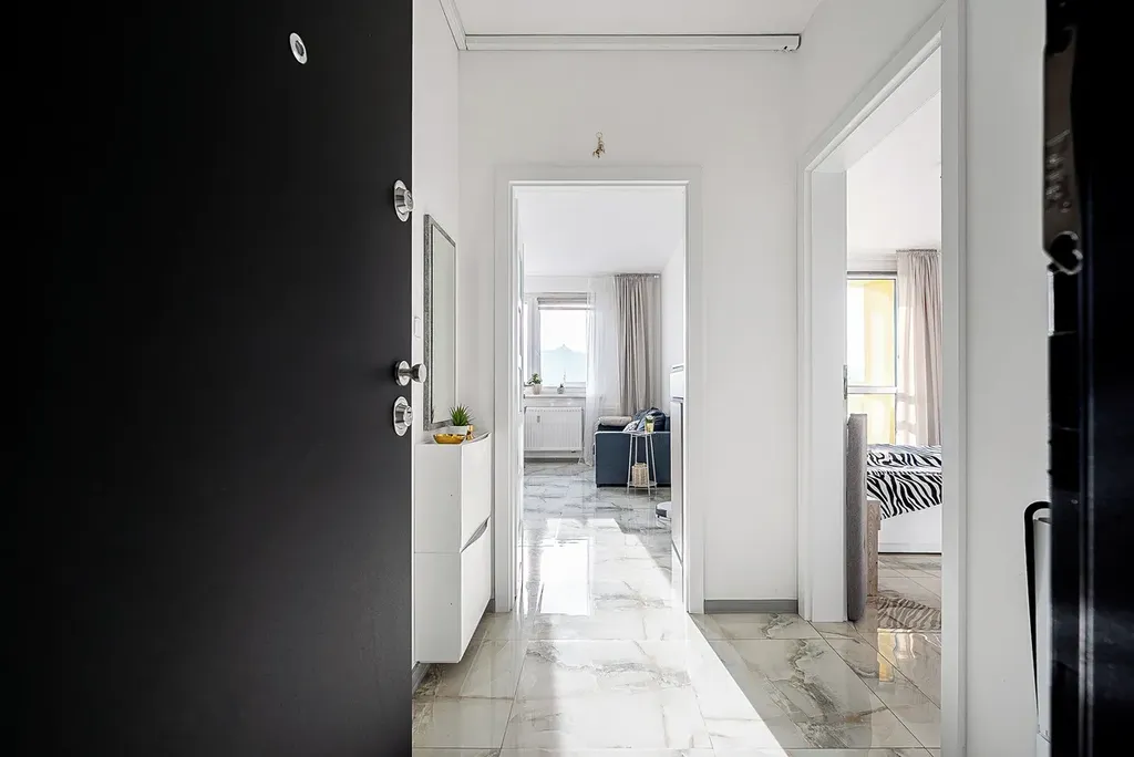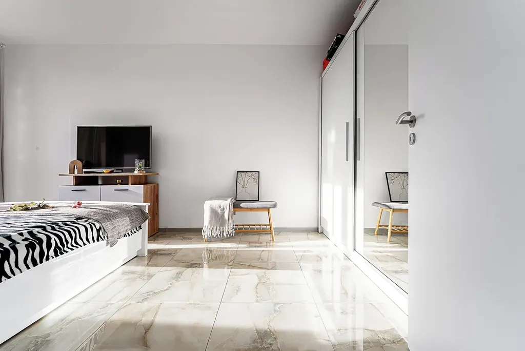 V celé bytové jednotce je položena dlažba s imitací mramoru, která je odolná, nadčasová a nenáročná na údržbu.