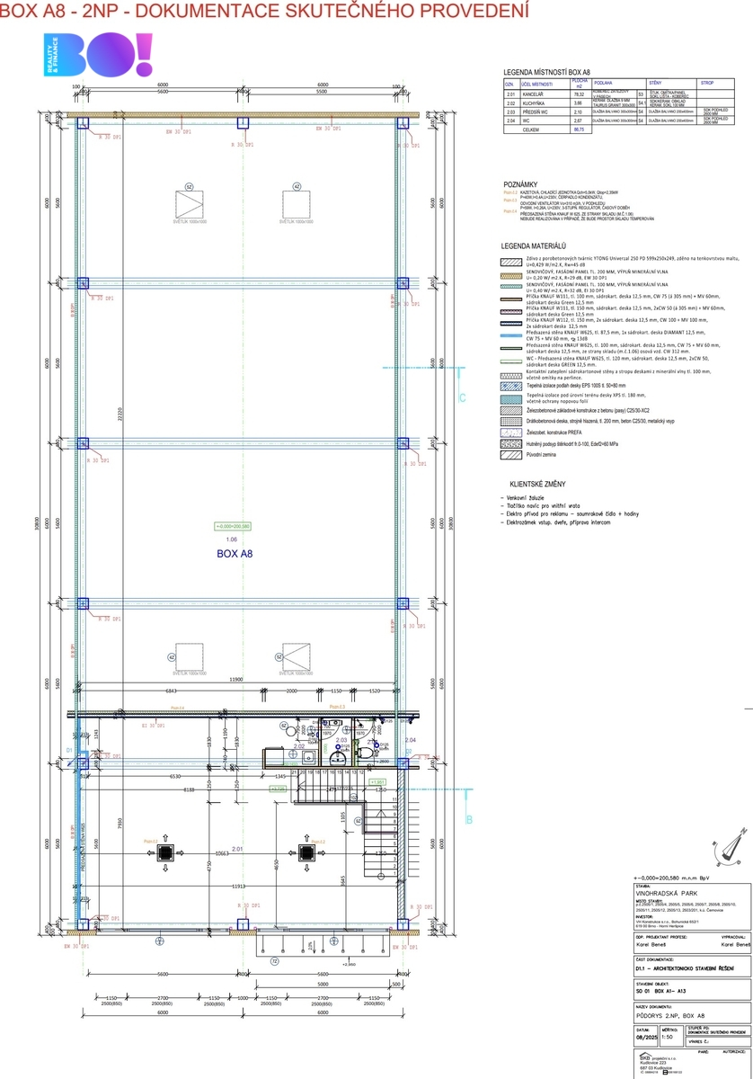 Box je dispozičně rozdělen na administrativně-obchodní část (2. podlaží) v přední části a halovou část v zadní části, vhodnou pro sklad, výrobu či prodej. Každá jednotka má vlastní vjezd i vstup, venkovní plochu pro parkování a manipulaci a zajištěný bezproblémový příjezd i pro kamionovou dopravu.