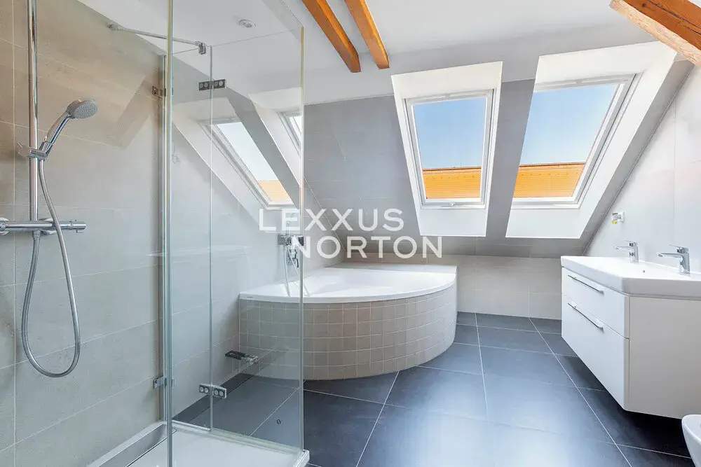Prostorný byt v posledním patře domu na rohu ulic Kafkova a Buzulucká v Dejvicích je atraktivní svým řešením, kde celá plocha interiéru o rozloze 238m2 je rozložena pouze v 5.NP a schodiště tak využijeme pouze když chceme vyjít ven na střešní terasu o ploše 51m2. Byt je uspořádán do dispozice se čtyřmi ložnicemi, každá s vlastní koupelnou, velkého obývacího pokoje situovaného na jihozápad a samostatnou oddělenou kuchyní s jídelnou, ze které vede již zmíněné schodiště na střešní terasu. Terasa, ač rozměrná, je zcela skryta za hřebenem střechy a pobyt na ní je tak chráněn před pohledy z okolních domů. Podlaha terasy je staticky zesílena pro umístění venkovní vířivky. Vrátíme-li se do interiéru, nesmíme zapomenout zmínit, že jedna z ložnic bytu je situována a stavebně připravena tak, že jí lze využít pro samostatné oddělené užívání. Otevírá se zde tedy možnost vícegeneračního bydlení se studujícím dítětem nebo seniorním rodičem. Alternativou je i možnost vložení vstupních dveří do této části bytu a vznikne zde nezávislá garsoniéra s možností externího pronájmu. Vytápění a měření energií s touto možností počítá. Interiér bytu je dobře osluněn, místnosti prostorné, zařízení je vyvedeno v přírodních světlých tónech. V domě je k dispozici nový výtah s výstupem přímo u bytu. Interiér domu je čistý a průběžně udržovaný. Péčí SVJ domu je současné době budována kancelář v 1.PP s okny do ulice, která bude externě pronajímána a příjmy z tohoto pronájmu plynoucí budou důležitým benefitem všem vlastníkům v domě. Ve vnitrobloku je také k dispozici vnitřní klidná zahrada s lavičkami a vzrostlou zelení.