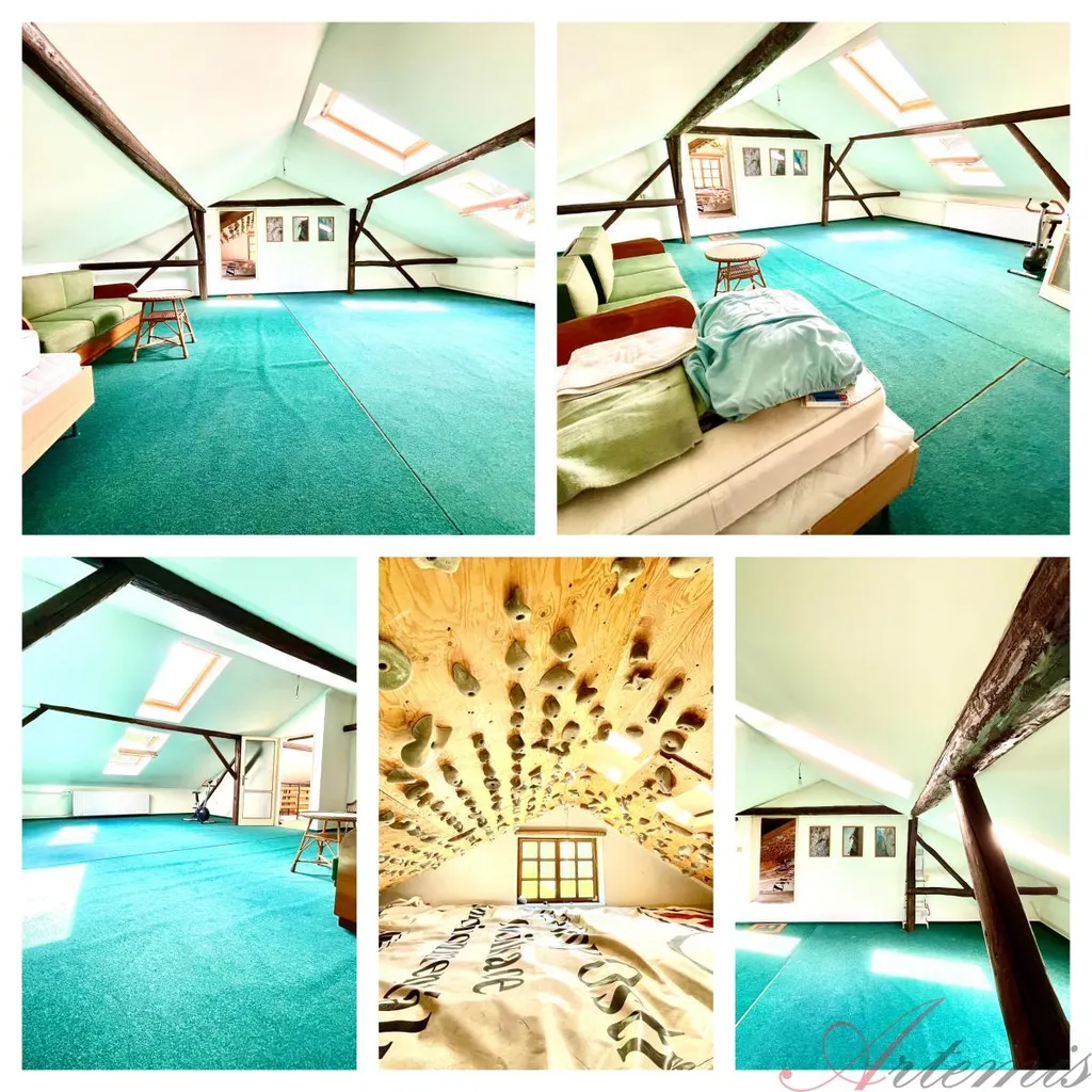 V 1.NP je vstupní hala, kuchyňka, dvě koupelny + 2 WC, šest prostorných místností - aktuálně využívaných coby kanceláře, technická místnost a chodba, navazující na podkroví. V podkroví je pak koupelna + WC, tři prostorné místosti a boulderingová stěna. Výrobní hala je rozlehlá, zateplená, s vysokými stropy a možností vytápění kotlem na tuhá paliva.