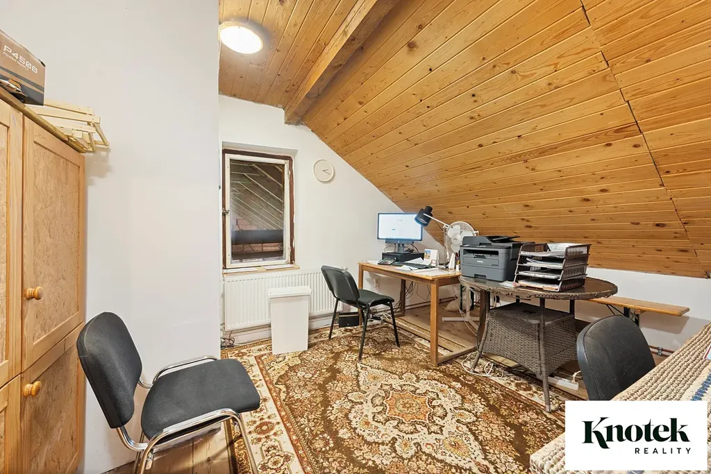 V podkroví jsou 3 kanceláře se sociálním zázemím (kuchyň, wc, sprcha, šatna), užitná plocha činí 66,44 m2.