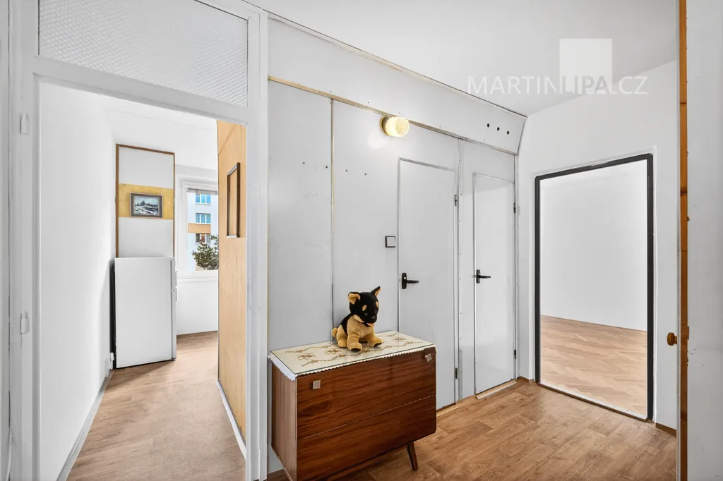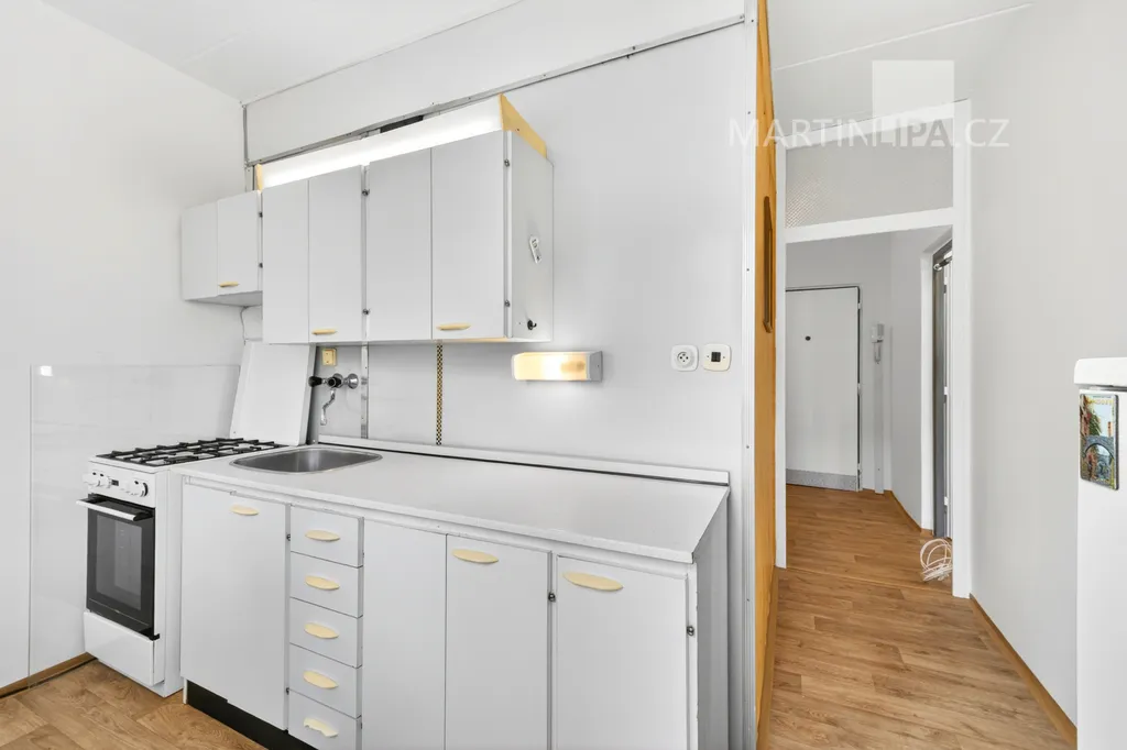 K dispozici jsou dva neprůchozí pokoje, každý o výměře 16,5 m², takže byt dobře poslouží páru i dvěma osobám, které chtějí zachovat dostatek soukromí. Kuchyň je samostatná a vybavena plynovým sporákem a lednicí. Koupelna je s vanou, toaleta oddělená. V předsíni jsou vestavěné skříně. Bytové jádro je původní umakartové, vybavení starší, ale funkční.