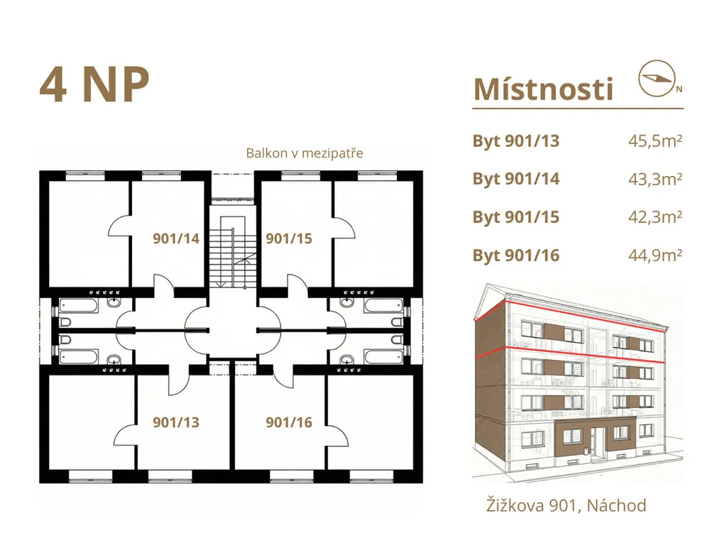 Investoři, věnujte pozornost této nabídce. Nabízíme k prodeji světlý a praktický byt o dispozici 2+kk a celkové ploše 48 m² (45 m bytová jednotka, 3 m sklep), umístěný ve 4. patře cihlového domu v klidné lokaci na Žižkova v Náchodě. Jedná se o bytovou jednotku 901/13.