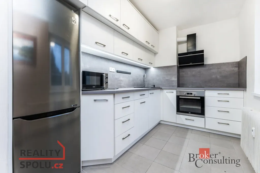 V bytě zůstává kuchyň a vestavěné skříně.