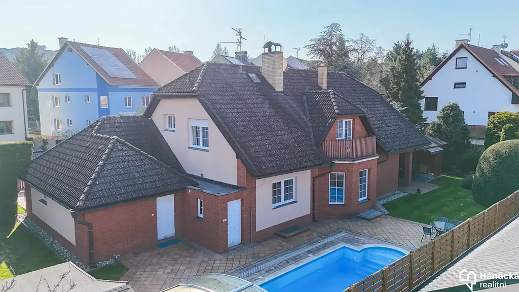 Dům stojí na pozemku o celkové výměře 939 m², přičemž zastavěná plocha činí 227 m². Součástí pozemku je také prostorný bazén, zahradní domek a pergola s posezením, přístupná přímo z obývacího pokoje.