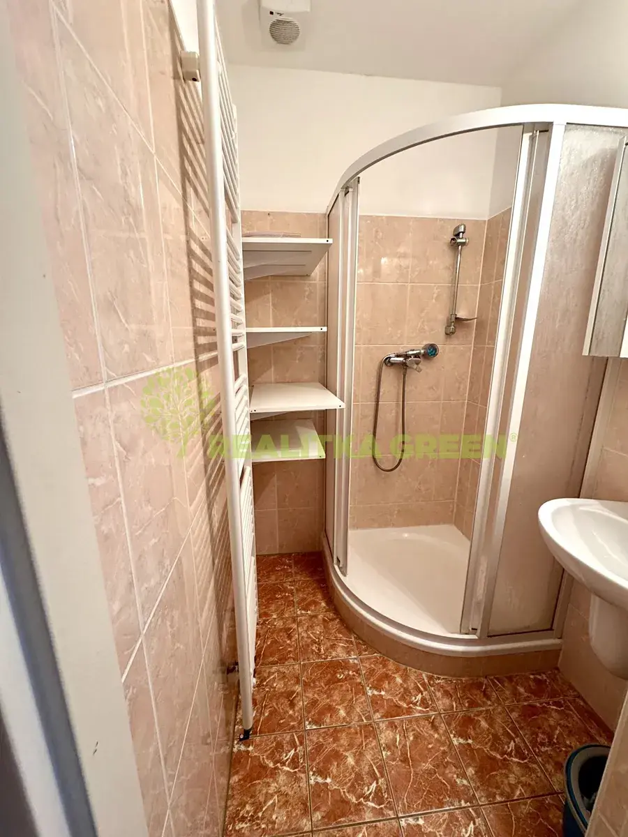 Dispozičně: vstupní chodba, koupelna se sprchovým koutem, samostatné wc, pokoj společný s kuchyňským koutem.