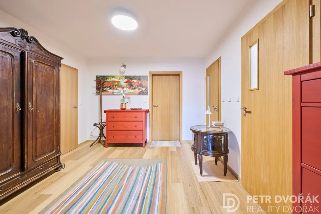 Prostorný byt v osobním vlastnictví o současné dispozici 4+1 s halou a podlahové ploše 109,8 m², situovaný ve druhém nadzemním podlaží nízkopodlažního domu rodinného charakteru v historickém jádru starých Stodůlek. Součástí jsou dva sklepy (2 × 3,4 m²) a lodžie 6,9 m² — celková užitná plocha dosahuje 124,3 m².