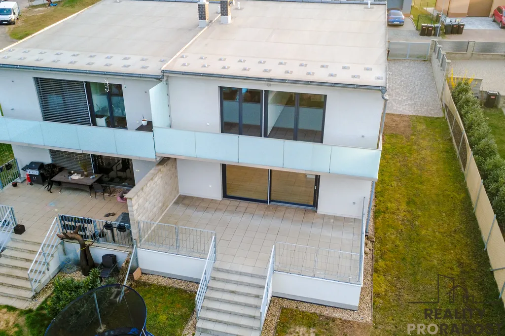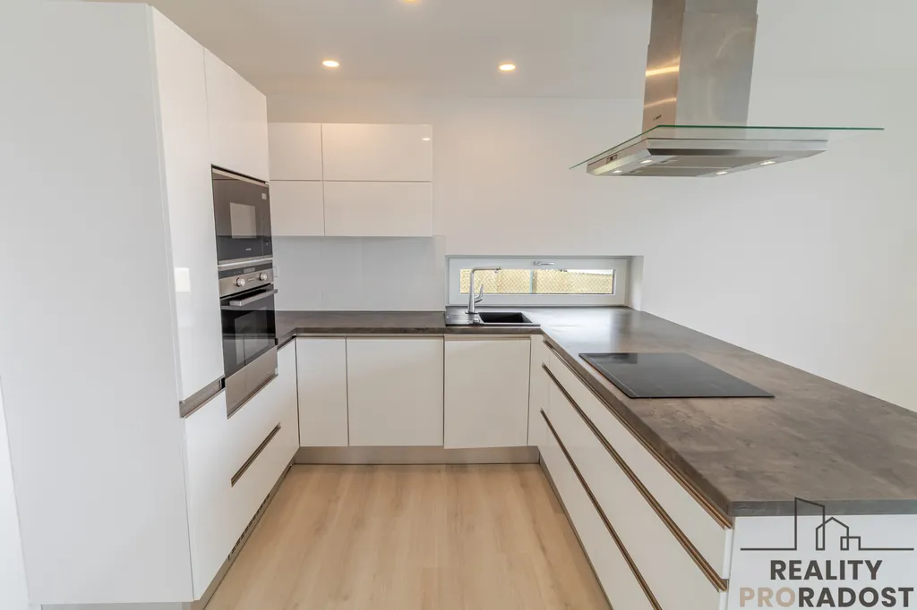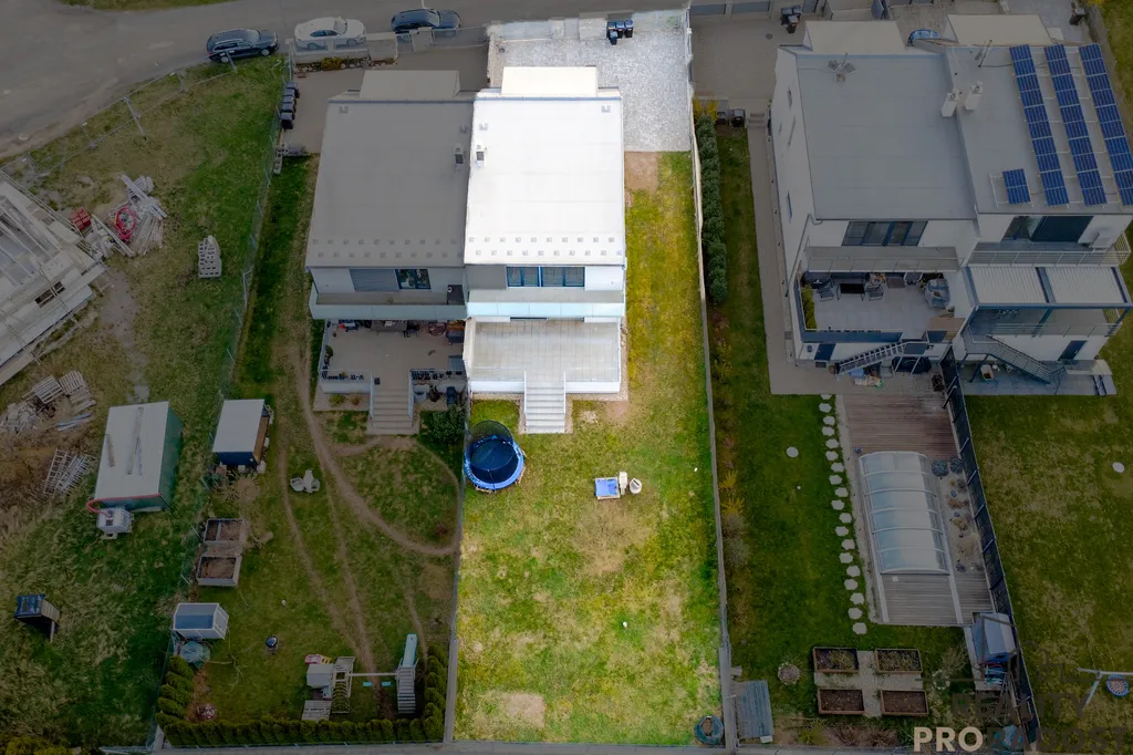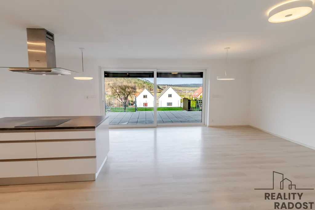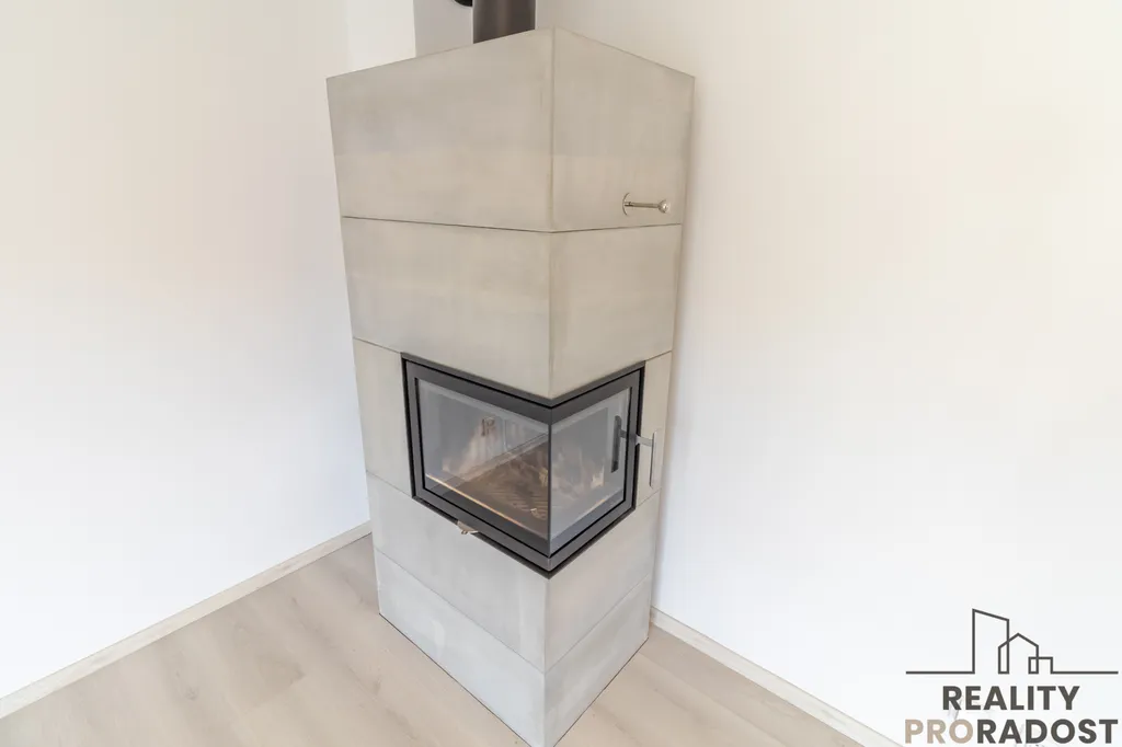 Přízemí: otevřený obývací pokoj s kuchyní a velkými posuvnými dveřmi na nádhernou terasu 28,5m2 s výhledem na zahradu a kopce. Dominantou jsou akumulační kamna Nordpeis Salzburg C – po přiložení sálají teplo 12–24 hod. Kuchyňská linka v vysokém bílém lesku s panty Blum, granitovým dřezem a spotřebiči Philco. Dále zádveří, koupelna se sprchou a WC, technická místnost a garáž 21,1 m² s el. vraty Hörmann.