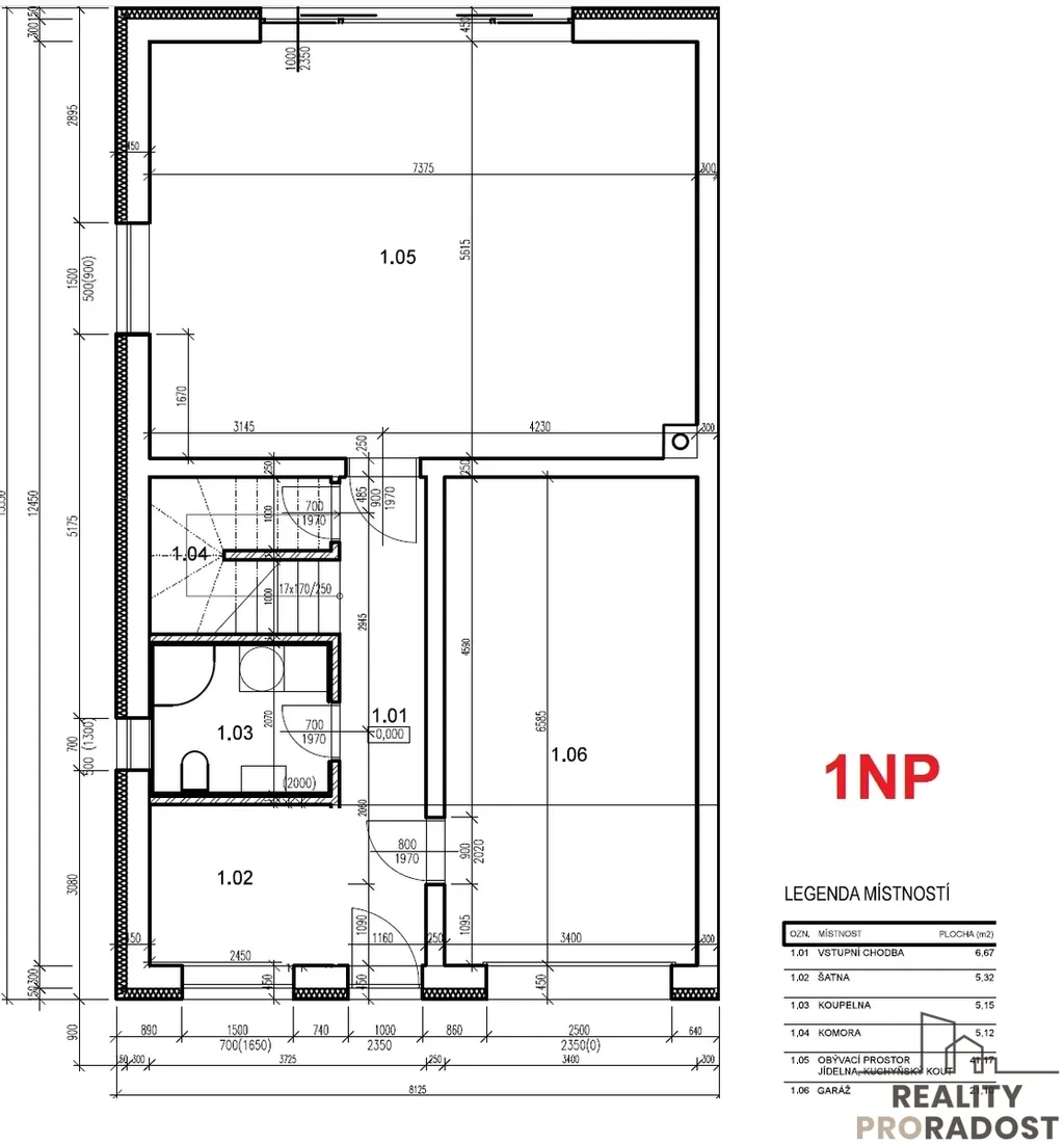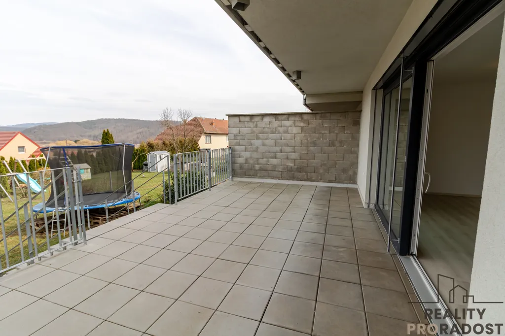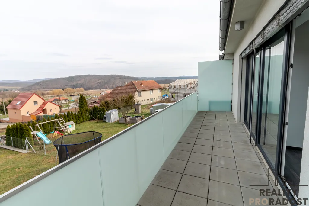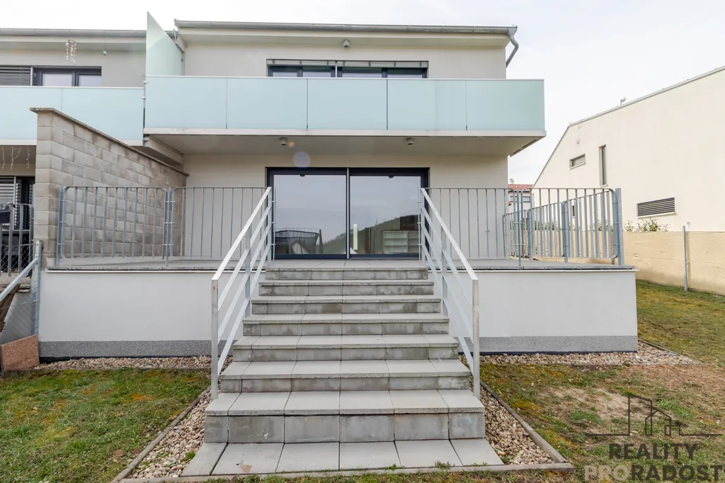 Přízemí: otevřený obývací pokoj s kuchyní a velkými posuvnými dveřmi na nádhernou terasu 28,5m2 s výhledem na zahradu a kopce. Dominantou jsou akumulační kamna Nordpeis Salzburg C – po přiložení sálají teplo 12–24 hod. Kuchyňská linka v vysokém bílém lesku s panty Blum, granitovým dřezem a spotřebiči Philco. Dále zádveří, koupelna se sprchou a WC, technická místnost a garáž 21,1 m² s el. vraty Hörmann.
