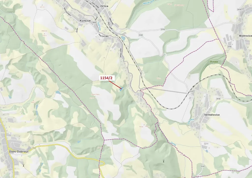Lesní pozemek o výměře 3699 m2, parcelní číslo 1154/2, podíl 1/1, katastrální území Kunčice u Letohradu, obec Letohrad, obec s rozšířenou působností Žamberk, okres Ústí nad Orlicí, Pardubický kraj. Po těžbě.