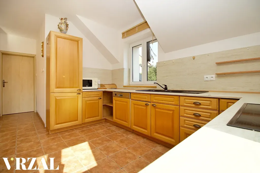 - Kuchyňská linka je plně vybavena kvalitními spotřebiči, na chodbě a v pokojích se nachází na míru vyrobené vestavné skříně.