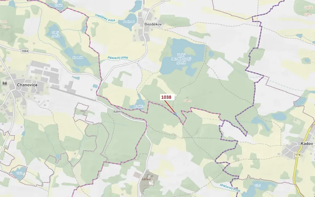 Lesní pozemek o výměře 1 028 m2, parcelní číslo 1038, podíl 1/1, katastrální území Bezděkov u Kasejovic, obec Hradiště, obec s rozšířenou působností Nepomuk, okres Plzeň-jih, Plzeňský kraj. Po těžbě.