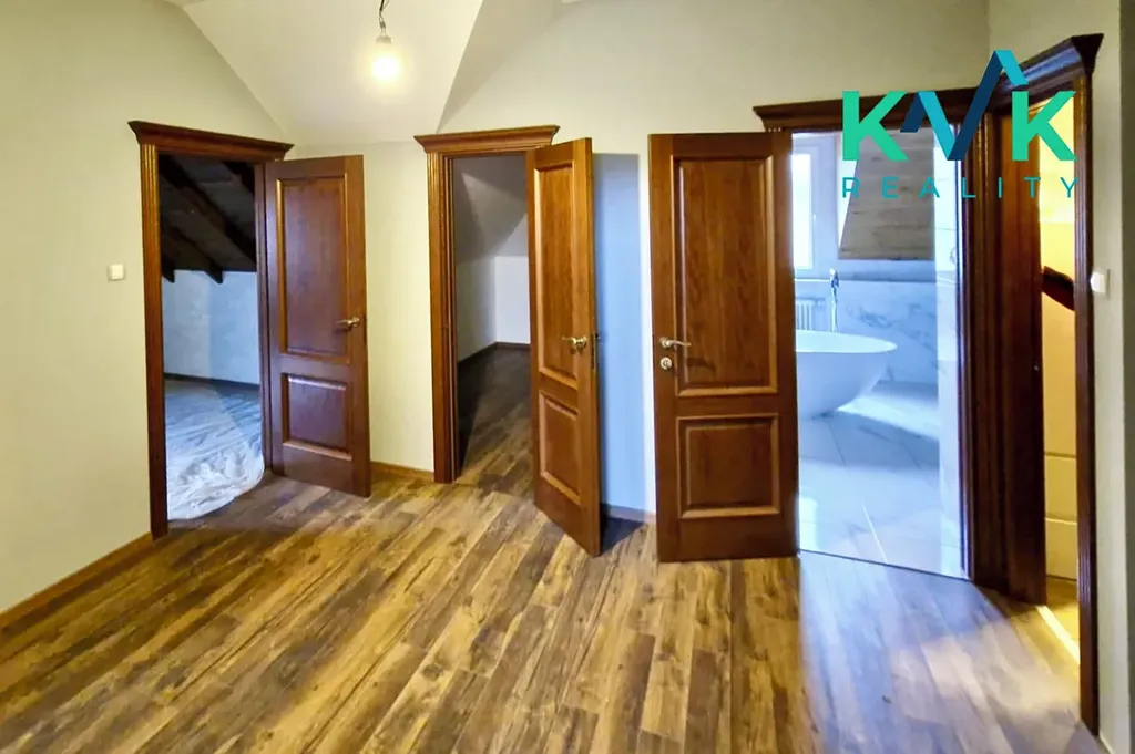 V prvním nadzemním podlaží se nachází tři prostorné ložnice a luxusně řešená koupelna, která nabízí volně stojící vanu, nadstandardně velký sprchový kout, bidet a toaletu – ideální místo pro každodenní relaxaci.
