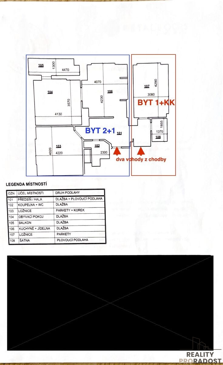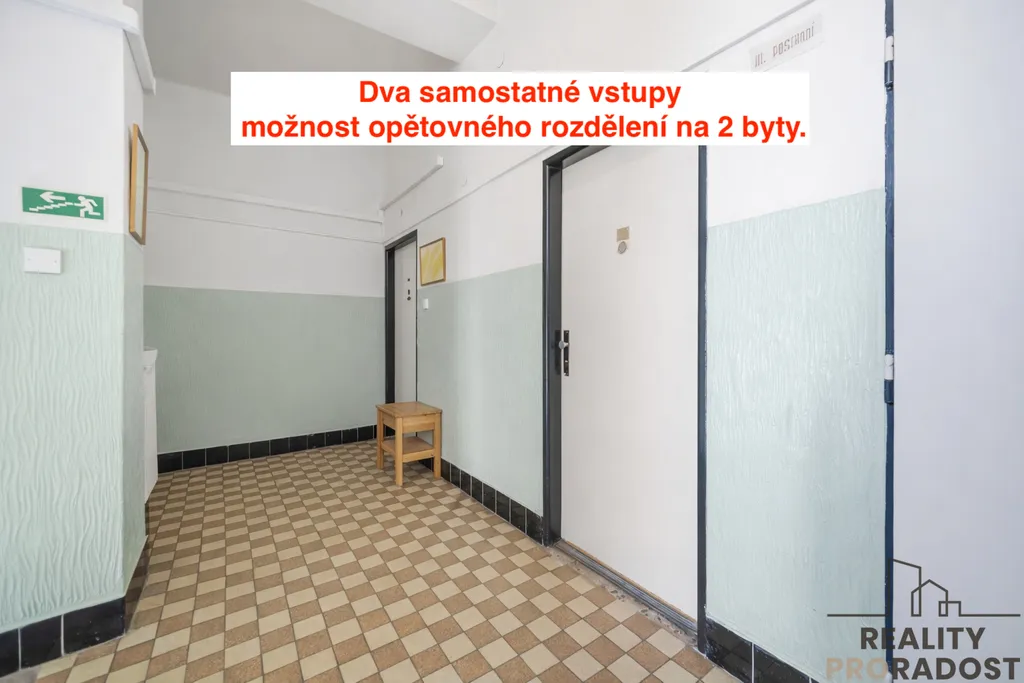 Zcela zásadní výhodou této nemovitosti je skutečnost, že byt vznikl spojením dvou samostatných bytových jednotek. Tento stav je dodnes patrný jak z půdorysu, tak i fyzicky – na společné chodbě jsou zachovány dva samostatné vstupy do bytu (aktuálně je využíván pouze jeden).