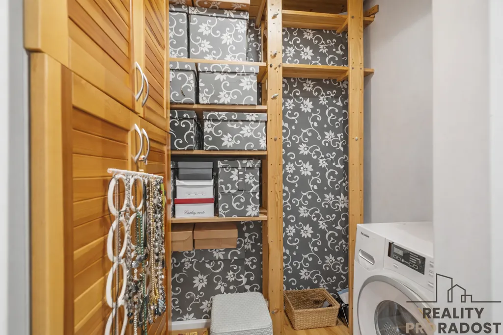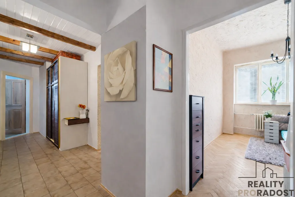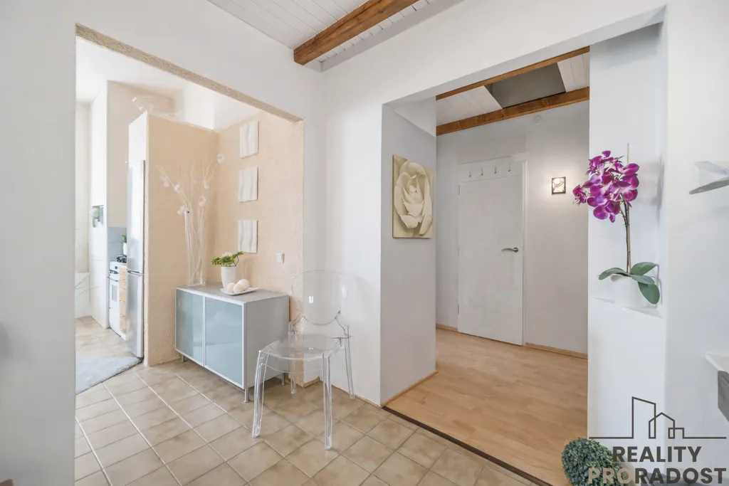 Dispozice bytu: vstupem se dostáváte do centrální chodby, kde jsou po celé její ploše snížené stropy s praktickým úložným prostorem. Po pravé straně se nachází komora s pračkou, která odpovídá původní koupelně menší bytové jednotky (1+kk), na niž navazuje samostatný pokoj. Dále se z chodby vstupuje do kuchyně s jídelní částí, na kterou navazuje obývací pokoj se vstupem na balkon. Z chodby je dále přístup do druhé koupelny s toaletou a do ložnice.