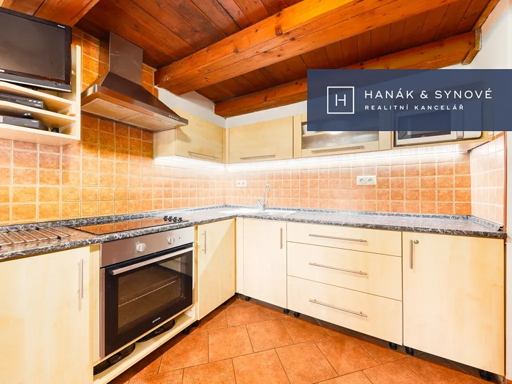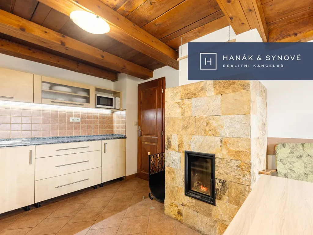 Přízemí chaty se otevírá vstupní chodbou, která nabízí praktický a přímý přístup do dřevníku i skladu, což zajišťuje maximální pohodlí při údržbě i ukládání věcí. Na chodbu plynule navazují vnitřní prostory domu, jimž dominuje hlavní obývací pokoj spojený s moderně vybavenou kuchyňskou linkou, která disponuje elektrickou troubou i elektrickým sporákem. Skutečným srdcem celého objektu jsou zdejší nádherná krbová kamna, která prostoru dodávají neopakovatelnou atmosféru a teplo. Kromě společenské části se v přízemí nachází také komfortní pokoj vybavený manželskou postelí, koupelna se sprchovým koutem, samostatná toaleta a nechybí ani praktická spíž pro uskladnění potravin. Podkroví nabízí dva oddělené pokoje přístupné z centrální chodby. První z nich je vybaven manželskou postelí, zatímco druhý disponuje čtyřmi lůžky a vstupem na balkon, který skýtá nádherný výhled do okolí.