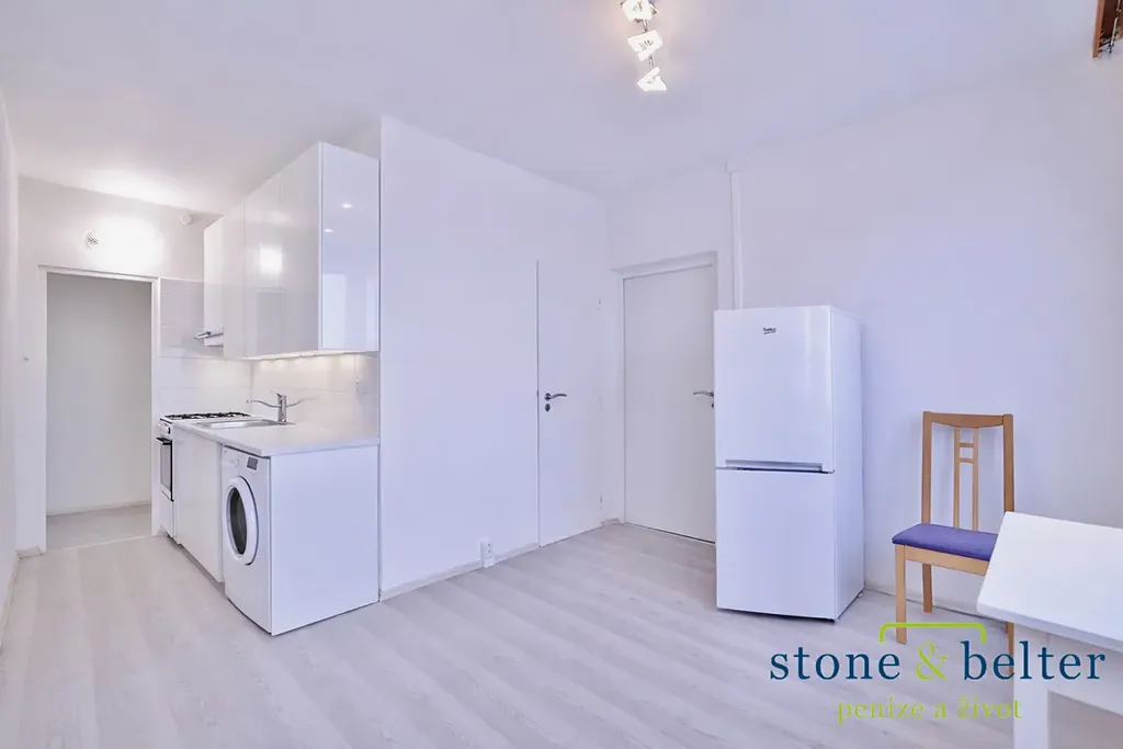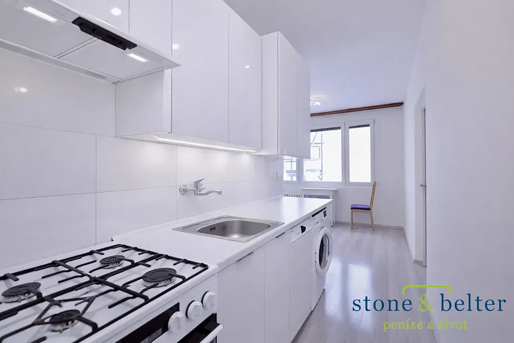 Kuchyně je vybavena kombinovaným plynovým sporákem, digestoří a úložnými skříňkami, myčkou a pračkou. K dispozici je také lednice a pračka. Jeden z pokojů je vybaven postelí s úložným prostorem. Součástí bytu je velká komora.