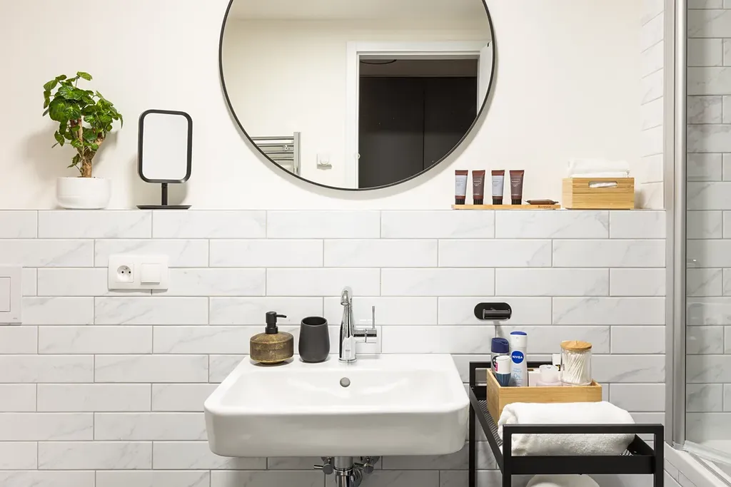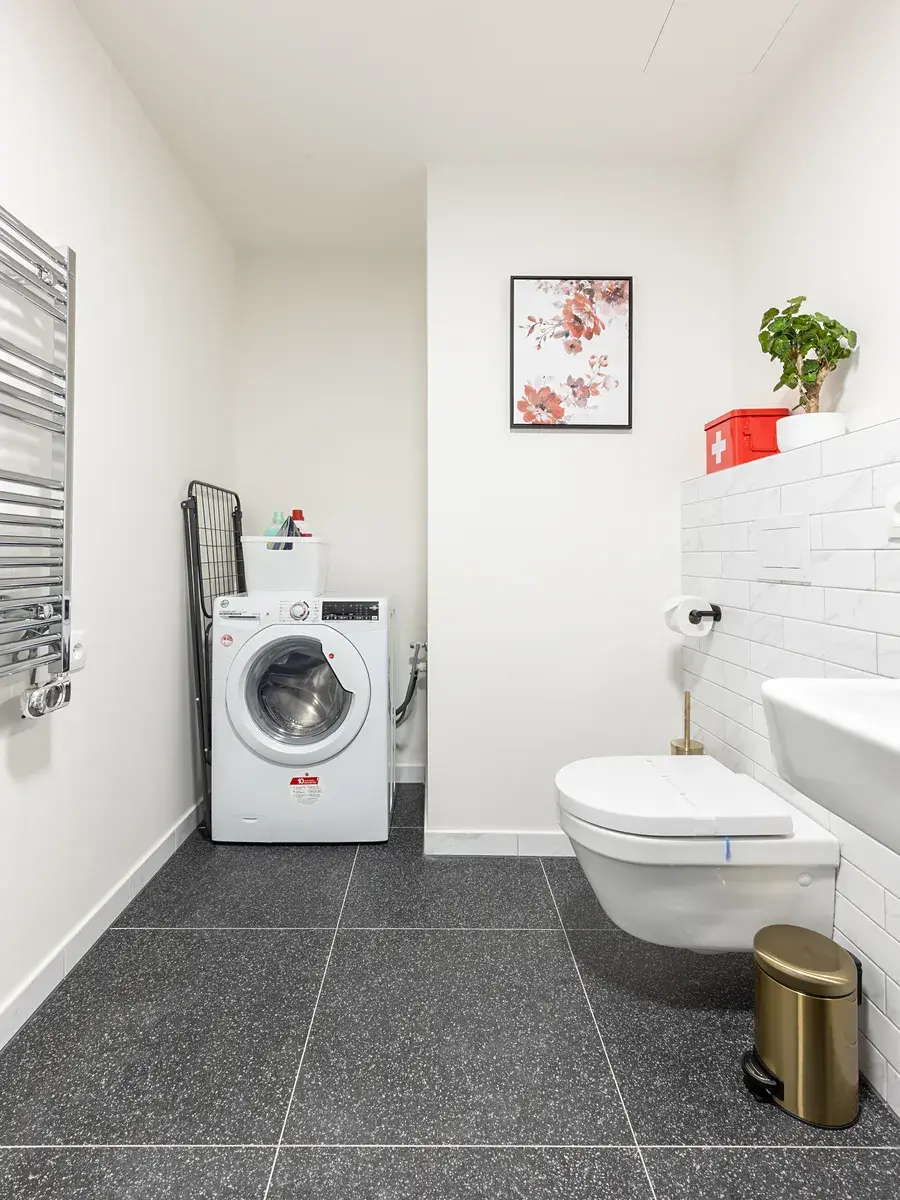 Koupelna je moderní a prostorná: vana se skleněnou přepážkou, umyvadlo, žebříkový radiátor, pračka a závěsné WC. Obklad v bílém mramoru (metro styl) a tmavá podlahová dlažba dodávají koupelně eleganci.
