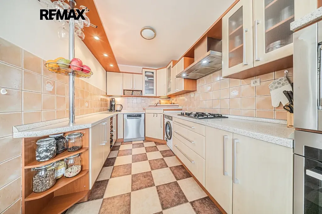 Dispozice bytu: prostorná vstupní chodba, dětský pokoj, pokoj, hlavní koupelna s vanou spojená s WC, spíž, obývací pokoj se vstupem na lodžii s posuvným zasklením, kuchyň, ložnice, druhá koupelna se sprchovým koutem a druhé samostatné WC.