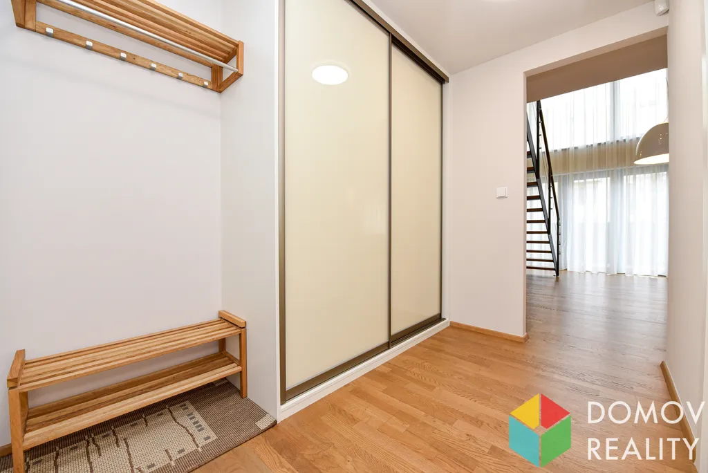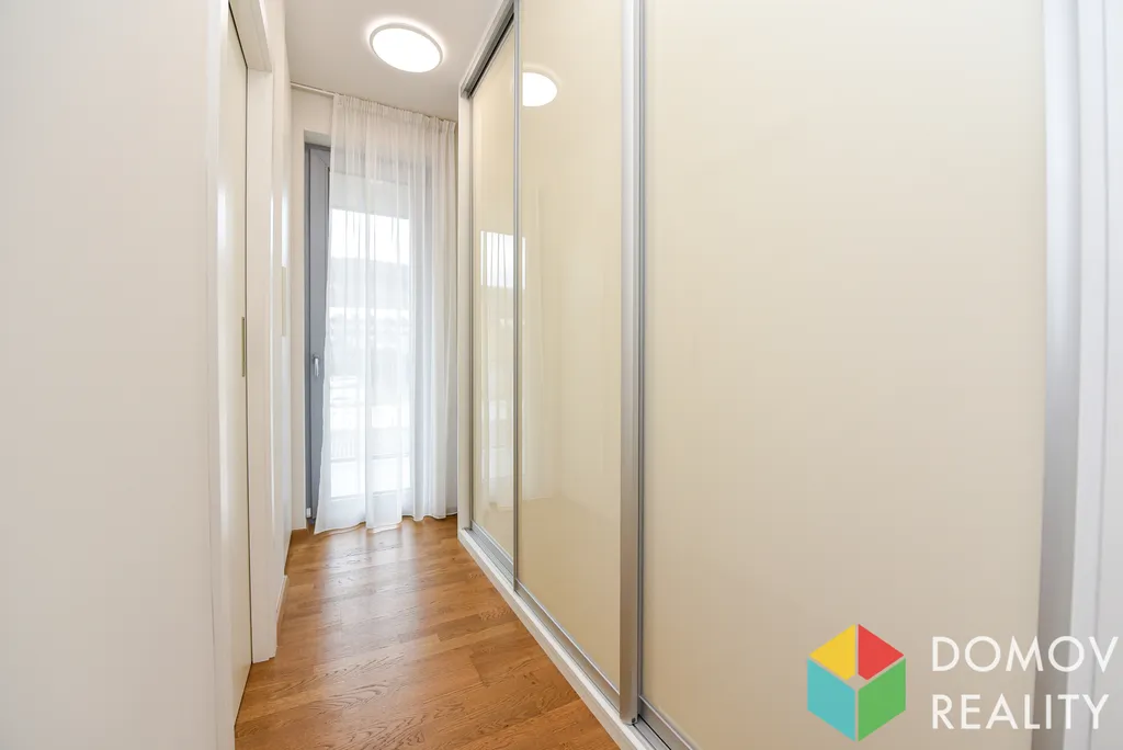 Díky otevřenému prostoru a velkorysým proskleným plochám byt působí zcela jedinečným dojmem. K jeho nadstandardnímu vybavení patří dubové podlahy, klimatizace, venkovní žaluzie, zabezpečovací systém (i ve sklepě), krásná kuchyňská linka od firmy Hanák s vestavnými spotřebiči Elektrolux, exkluzivnost podtrhuje pracovní deska z přírodního kamene.